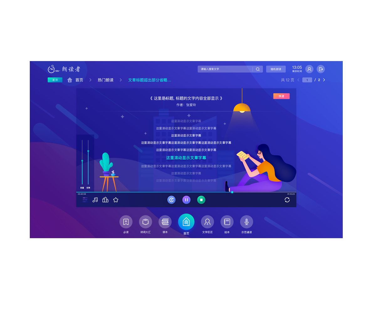 該模塊是展示一些示范誦讀的文章,用戶可以在該模塊中閱讀示范的讀法, 幫助用戶糾正自己在朗讀時(shí)的錯(cuò)誤,能夠有助于提升朗讀者的朗讀水平。